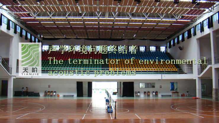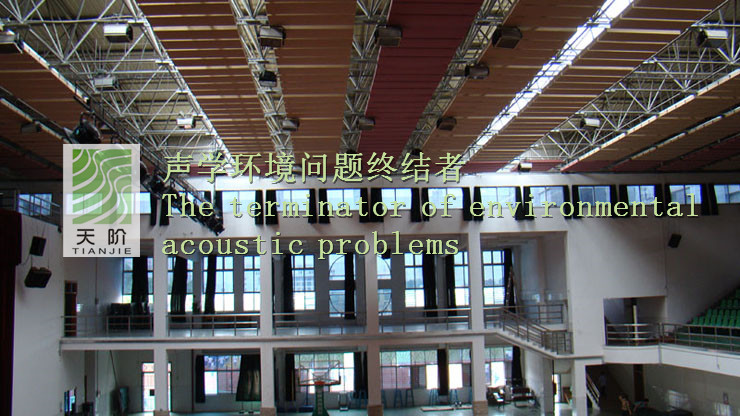 東莞中學體育館采用的是空間吸聲體。空間吸聲體是一種懸掛在頂棚具有高效吸收性能的吸聲材料。空間吸聲體一般水平或者垂直吊掛。空間吸聲體面積占頂棚面積30%-40%時其材料的吸聲性能是其他聲學材料吸聲性能的2倍。