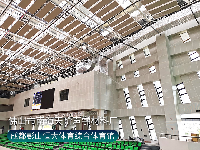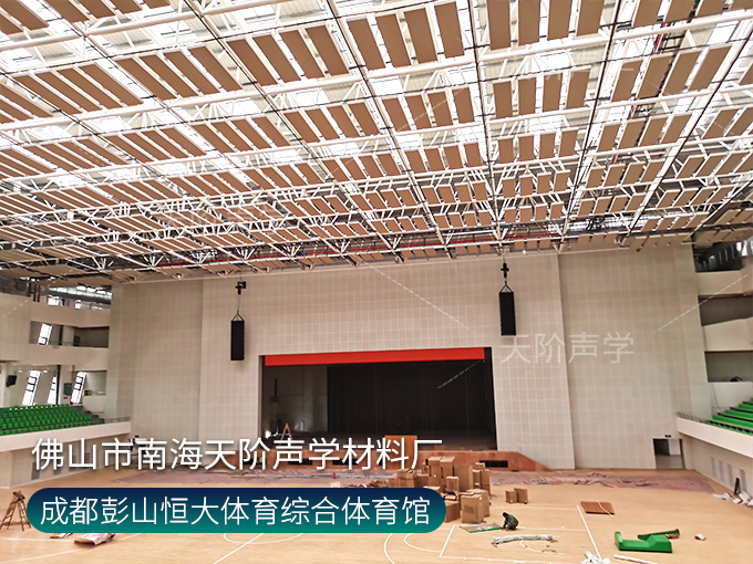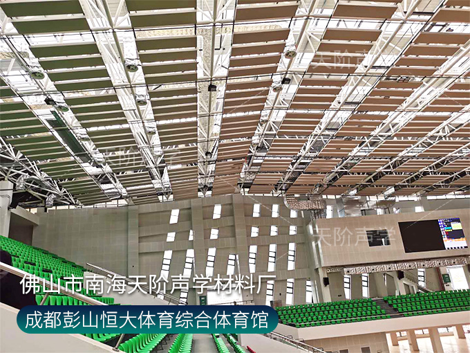 成都彭山恒大體育綜合體育館項目,墻面使用槽木吸音板,基材選用不燃堅硬的玻鎂基材,飾面選用活力青春的色調。條形開槽吸音板,吸音效果顯著,能吸收活動期間的噪音,回聲。