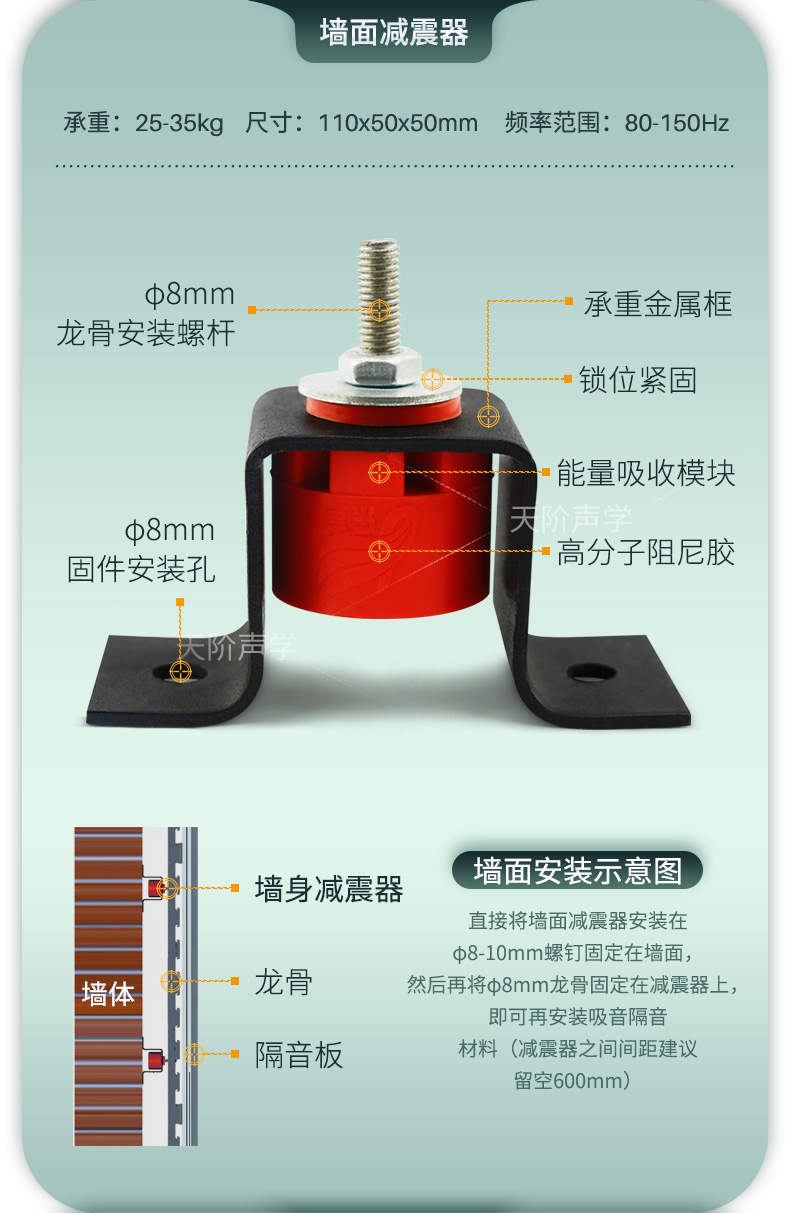 天花墻體隔音減震器是用于天花墻體隔音的必要構件。它特有的阻尼橡膠塊可以切斷聲橋的傳播,尤其對KTV、酒吧里有低音炮的地方,這是重要的隔音系統配件,不然,無論多少隔材料都無法將聲音阻隔于包廂房內。