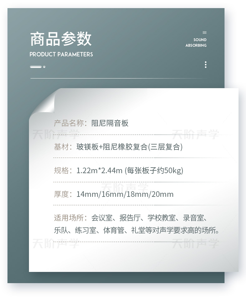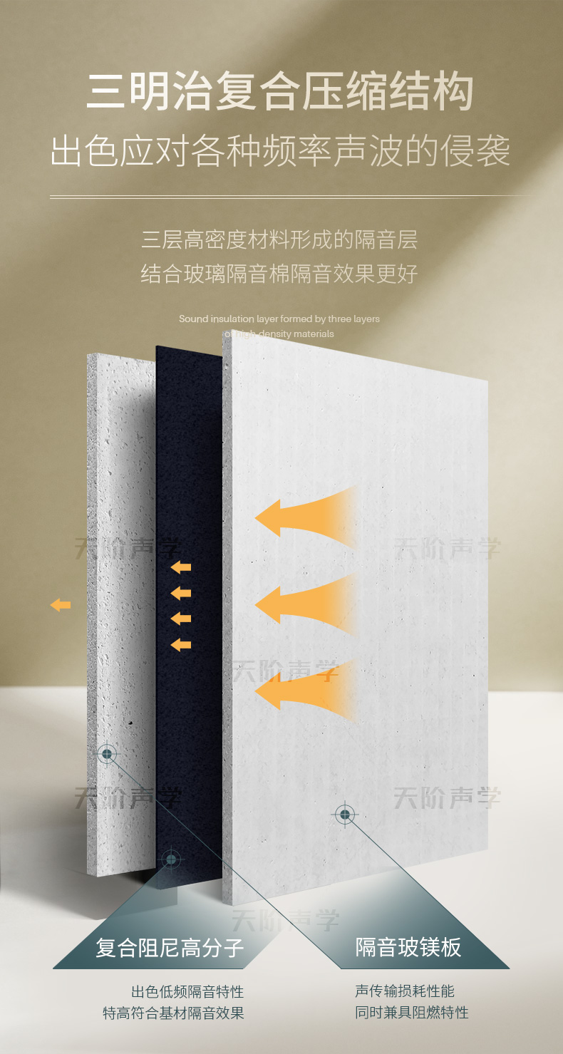 阻尼隔音板采用玻鎂基材,夾加高分子阻尼膠,三文治結構高壓復合成型,形成阻尼復合結構,改變原材質共振頻率,倍數提升原有材質空氣隔聲量和結構隔聲量。