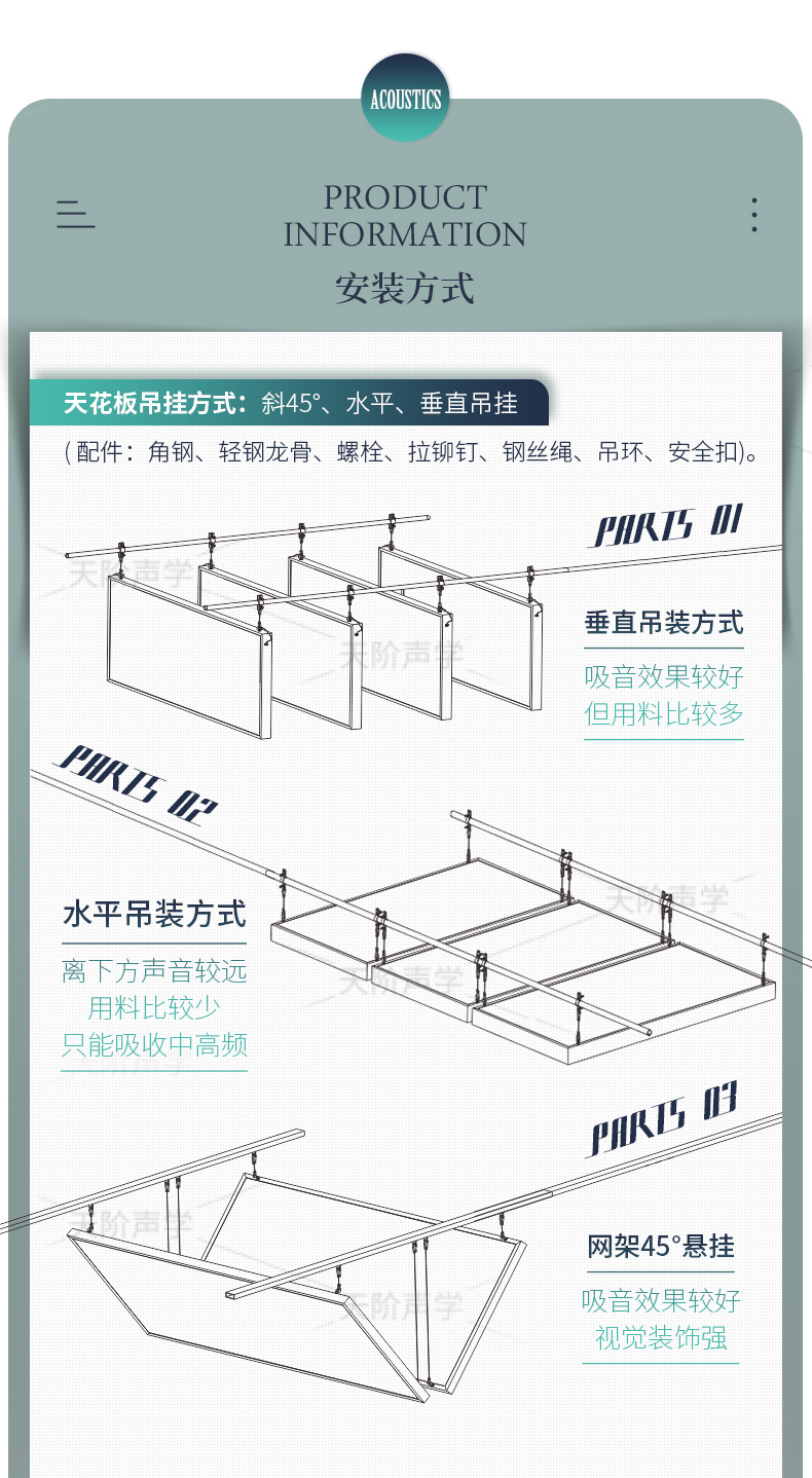 空間吸聲體大多懸掛于建筑物空間的頂部,且以離頂?shù)鯍炀佣唷0鍫羁臻g吸聲體可以水平分散吊掛,也可垂直分散吊掛,還可水平、垂直復(fù)合吊掛,在總面積相同情況下,降噪效