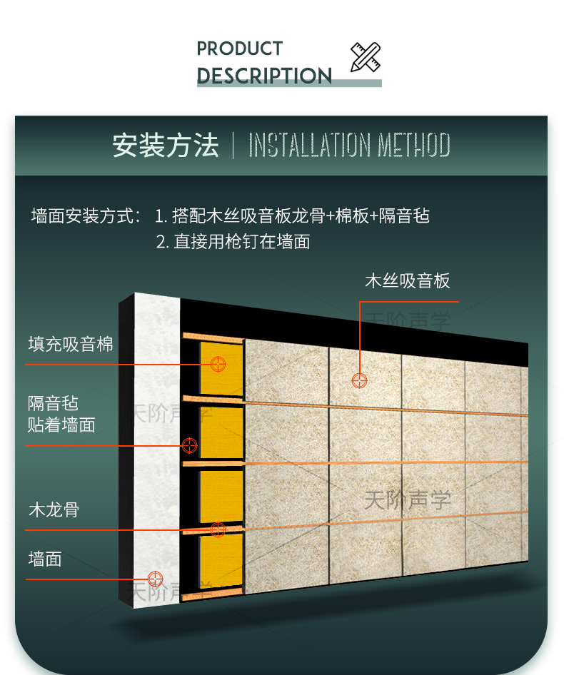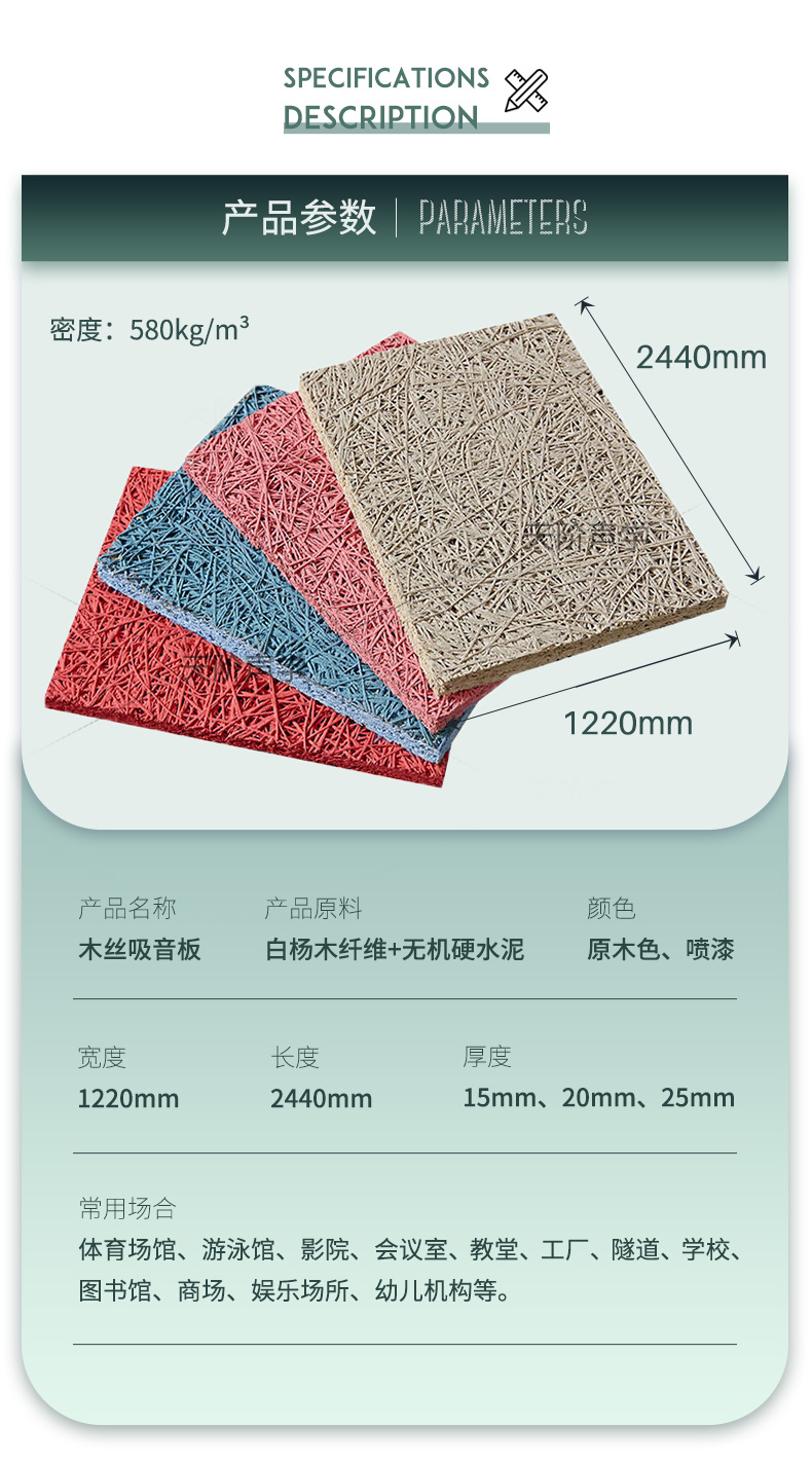 木絲吸音板以白楊木纖維為原料,結(jié)合獨(dú)特的無(wú)機(jī)硬水泥粘合劑,采用連續(xù)操作工藝,在高溫、高壓條件下制成。該產(chǎn)品擁有只有通過(guò)合成若干不同的建筑材料才能獲得的物理特性。外觀獨(dú)特、吸音良好--獨(dú)有的表面絲狀紋理,給人一種原始粗獷的感覺(jué),滿足了現(xiàn)代人回歸自然的理念。表面可做飾面噴色和噴繪處理.