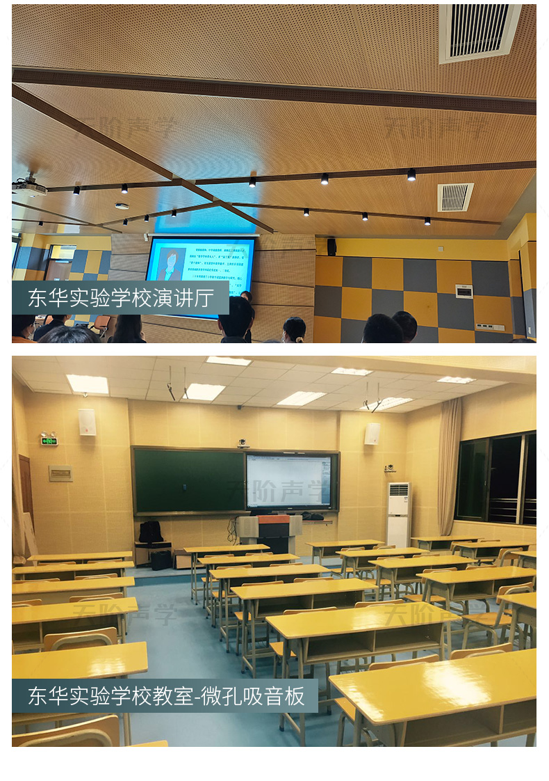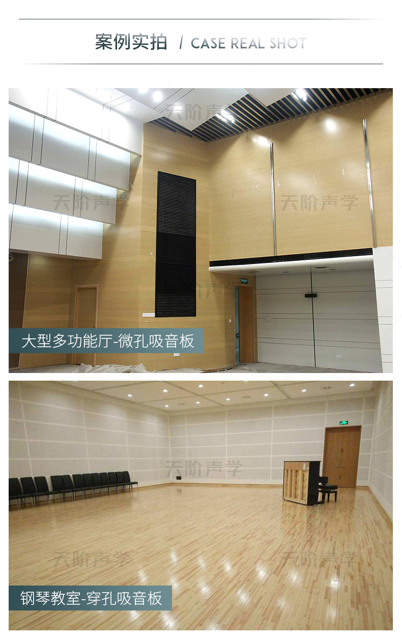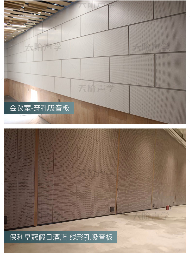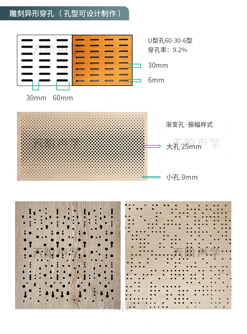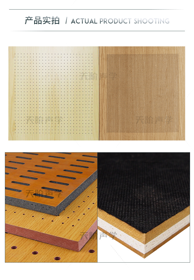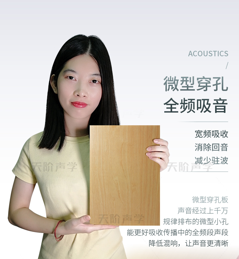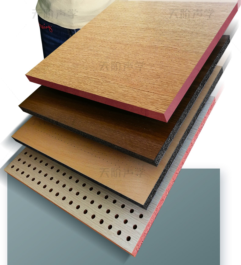 孔木吸音板是一種在密度板上直接穿孔的共振吸聲材料。孔木吸音板對吸聲頻譜選擇性較強,對低頻有很好的吸聲性能。如在吸聲結構后空腔上填入適量的吸聲棉可提高中、高頻吸聲效果。 我們的孔木吸音板: 天階聲學孔木吸音板采用高質的中纖板、具有環保、防火、防潮等性能,飾面顏色及材料選擇性廣,能很好地滿足客戶多樣化的聲學及裝飾需求。較槽木吸音板,孔木吸音板相對抗撞擊能力強。