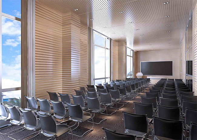 在大中型會議室內(nèi)部控制的難度是低頻混響時間混響由于觀眾廳座椅,毯窗戶和門窗簾,大多數(shù)建材是在高頻范圍內(nèi)顯示出其較好的吸聲性能。因此如無有效的聲學(xué)處理的低頻率,將勢必造成低頻混響時間過長影響語言清晰度。